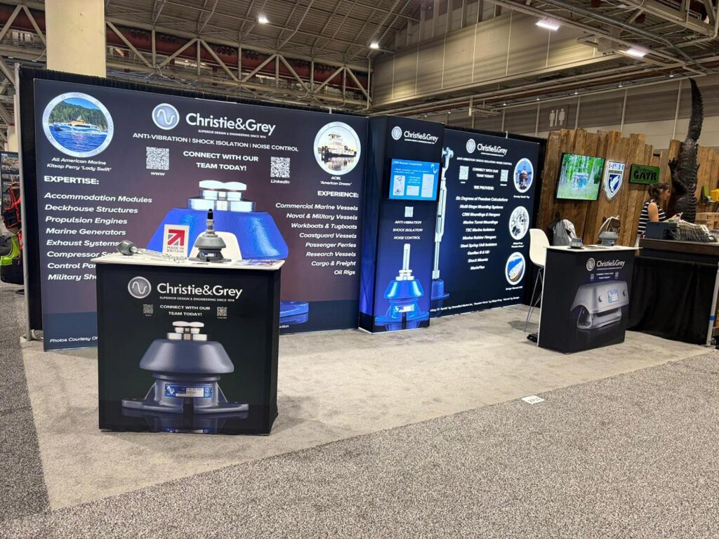 Throughout the show, the team showcased Christie & Grey’s anti-vibration and shock isolation solutions for marine and offshore applications, discussing how engineered isolation systems can support long-term performance, protect onboard equipment, and improve comfort across a wide range of vessel types.